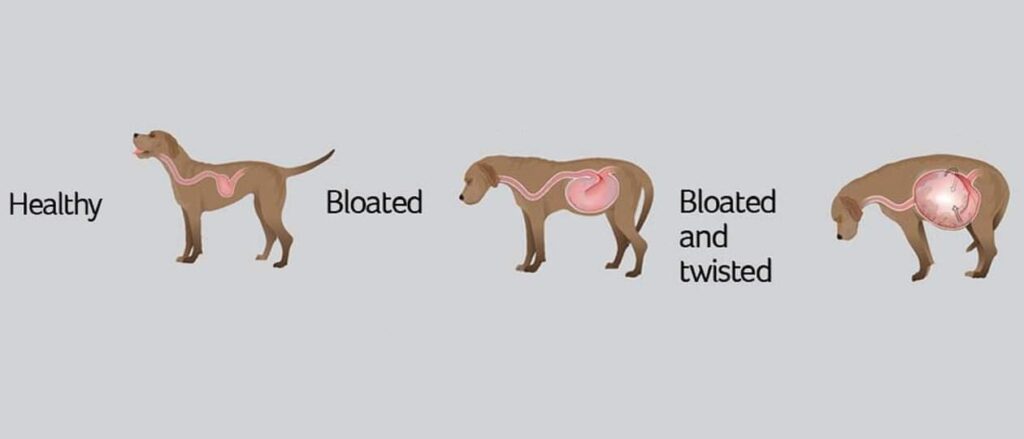 The abdominal swelling behind the ribs is also not always present, that is a common sign in less fit dogs, well conditioned dogs such as sporting or working dogs, or if you do any fitness with your pet, can have a good strong abdominal core which can hold the stomach up under the rib cage, then when the stomach expands will show as distention in the rib cage with a more barrel like shape to the whole body.
